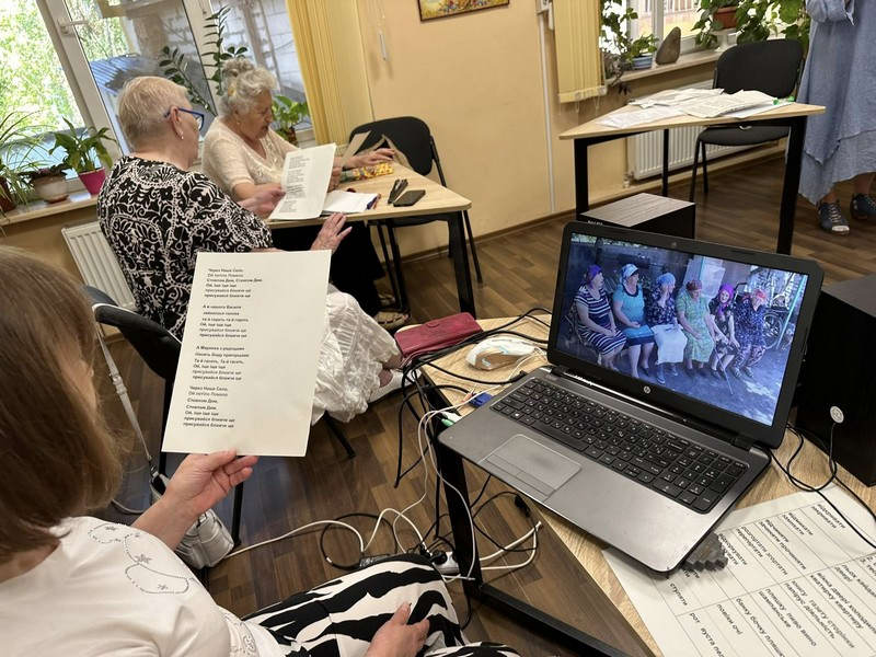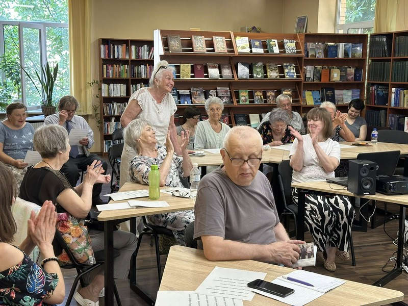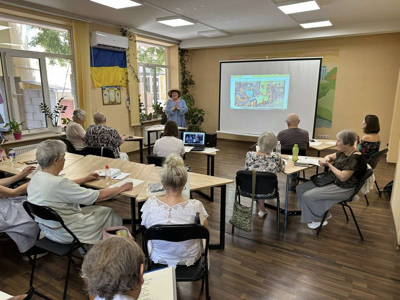 Перше заняття курсу української мови для студенток Університету третього віку Приморського терцентру та читачів бібліотеки було присвячене знайомству, пошуку синонімів до прикметників, що описують особистість. Також присутні тренувалися в побудові речень зі словами і словоформами.
